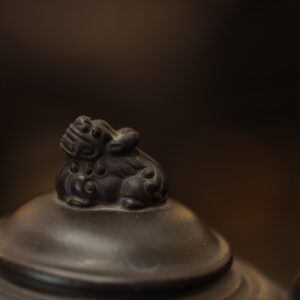 Miệng ấm vừa phải, cổ ngắn giúp thao tác cho trà và vệ sinh thuận tiện. Vòi ấm gọn, dòng nước ra đều; quai cầm dày tay, cân đối với thân ấm. Nắp ấm tạo hình linh thú, khít miệng, góp phần giữ nhiệt và hạn chế thất thoát hương trà.
