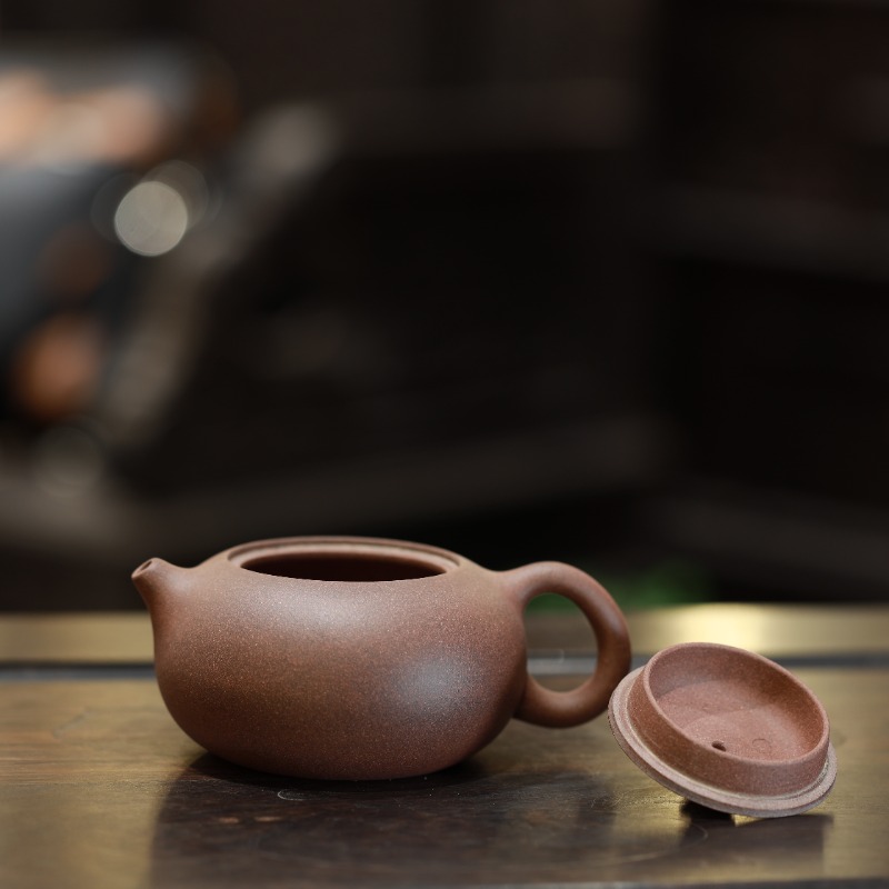 Ấm tử sa dáng Tây Thi, chế tác thủ công từ tử nê, dung tích 220ml. Dáng tròn đầy, thân ấm ôm nhiệt tốt, cho nước trà đậm vị, tròn miệng và hậu êm, phù hợp các buổi trà nhẹ, uống chậm và thưởng vị.