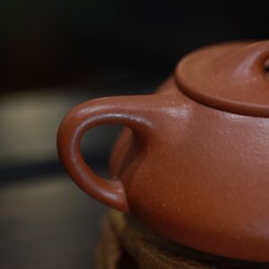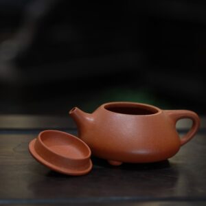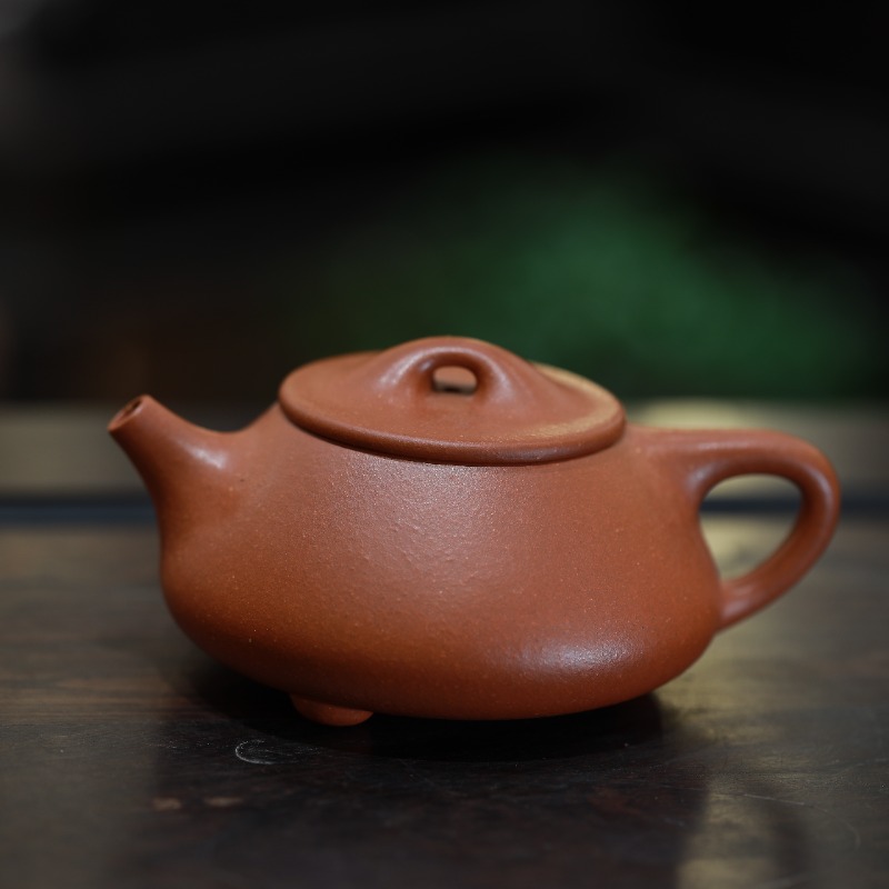 Ấm tử sa dáng Thạch Biều, chế tác thủ công từ thanh thủy nê, dung tích 250ml. Dáng tròn dẹt, thân thấp, giữ nhiệt ổn định nhưng thoát vị tốt, cho nước trà sáng, sạch, rõ tầng hương, phù hợp pha uống thư thái và thưởng hương.