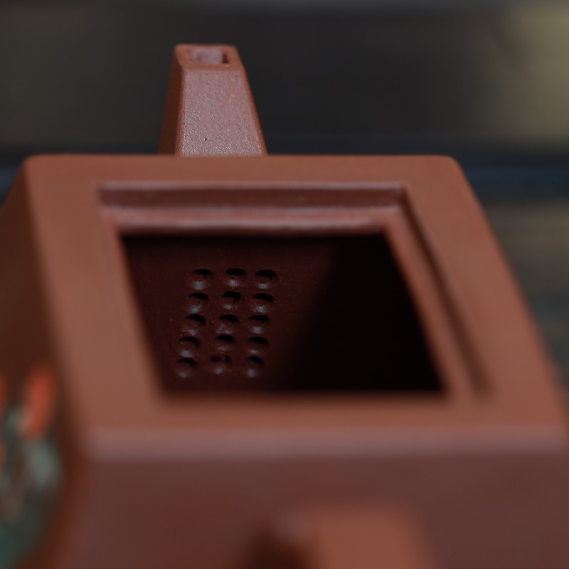 Bên thân ấm được trang trí thư họa thủ công với họa tiết hoa cỏ, bố cục cân đối, tạo điểm nhấn nghệ thuật mà không làm rối dáng ấm. Lưới lọc dạng đa lỗ bên trong thân, đảm bảo dòng chảy thông thoáng, phù hợp với nhiều loại trà lá.