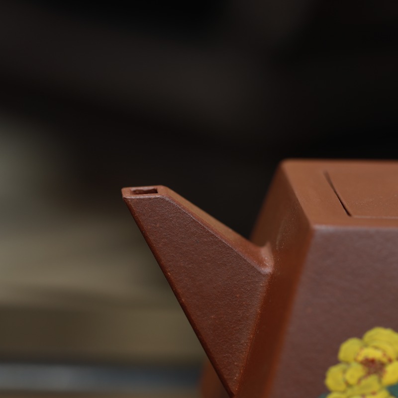 Phần vòi vuông thẳng, miệng vòi gọn, dòng nước ra dứt khoát. Quai vuông tạo hình đồng bộ với thân, chắc tay, dễ thao tác. Nắp vuông ăn khớp với miệng ấm, khít, giữ nhiệt tốt, núm nắp tạo hình giản lược nhưng hài hòa tổng thể.