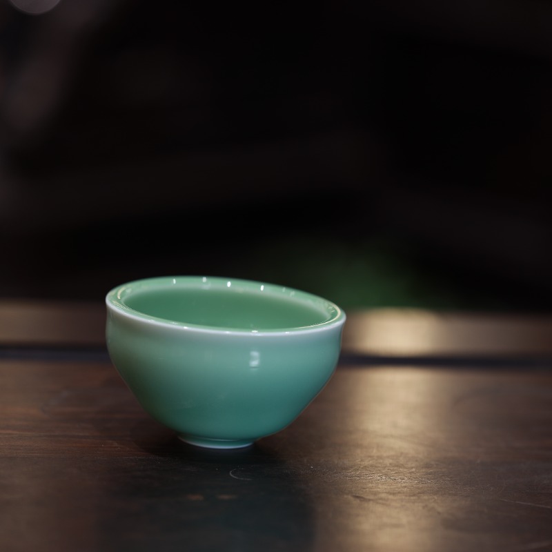 Bề mặt hoàn toàn không trang trí, tập trung vào chất men và dáng chén. Khi nhìn nghiêng hoặc dưới ánh sáng, độ trong và chiều sâu của men thể hiện rõ, tạo cảm giác thuần khiết và tĩnh.