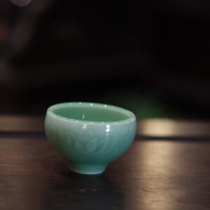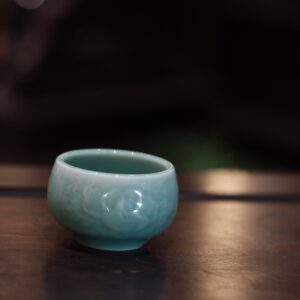 Hoa văn được khắc hoặc dập nhẹ trên thân chén trước khi phủ men. Sau khi nung, họa tiết hiện lên mờ ẩn dưới lớp men ngọc, không nổi gắt, tạo hiệu ứng thị giác mềm và có chiều sâu, đúng đặc trưng thẩm mỹ của celadon truyền thống.