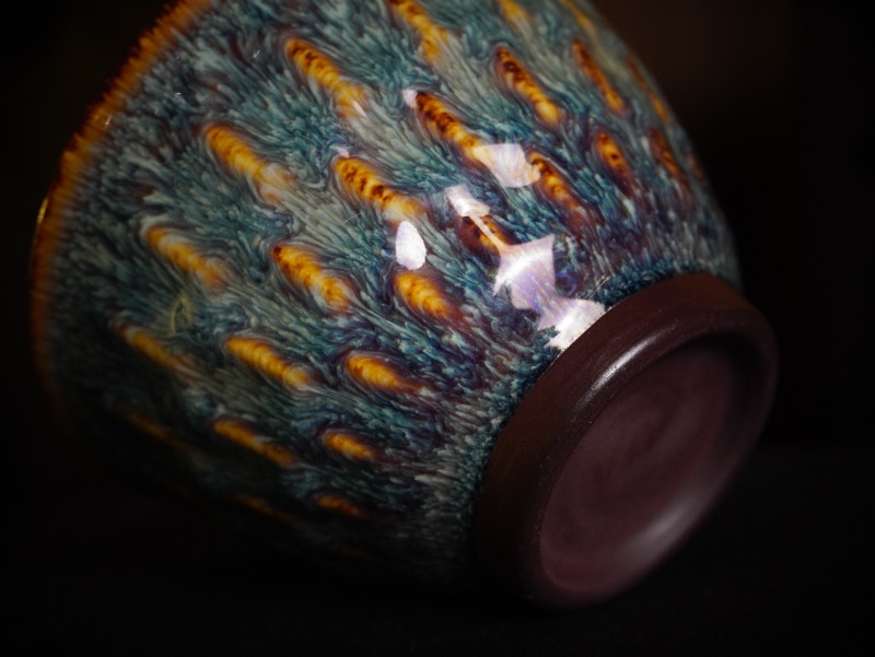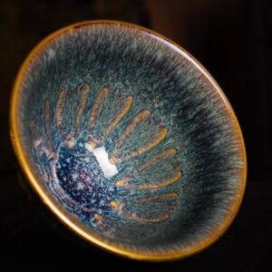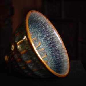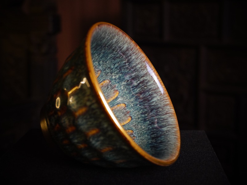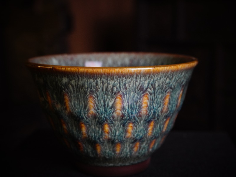Chén Thiên Mục men kết tinh, nổi bật với hiệu ứng “đuôi công” rõ nét: các dải kết tinh dạng vũ tiễn tỏa đều từ đáy lên thân, chuyển sắc xanh lam đậm – xanh lục trên nền men sẫm, xen kẽ ánh nâu hổ phách.